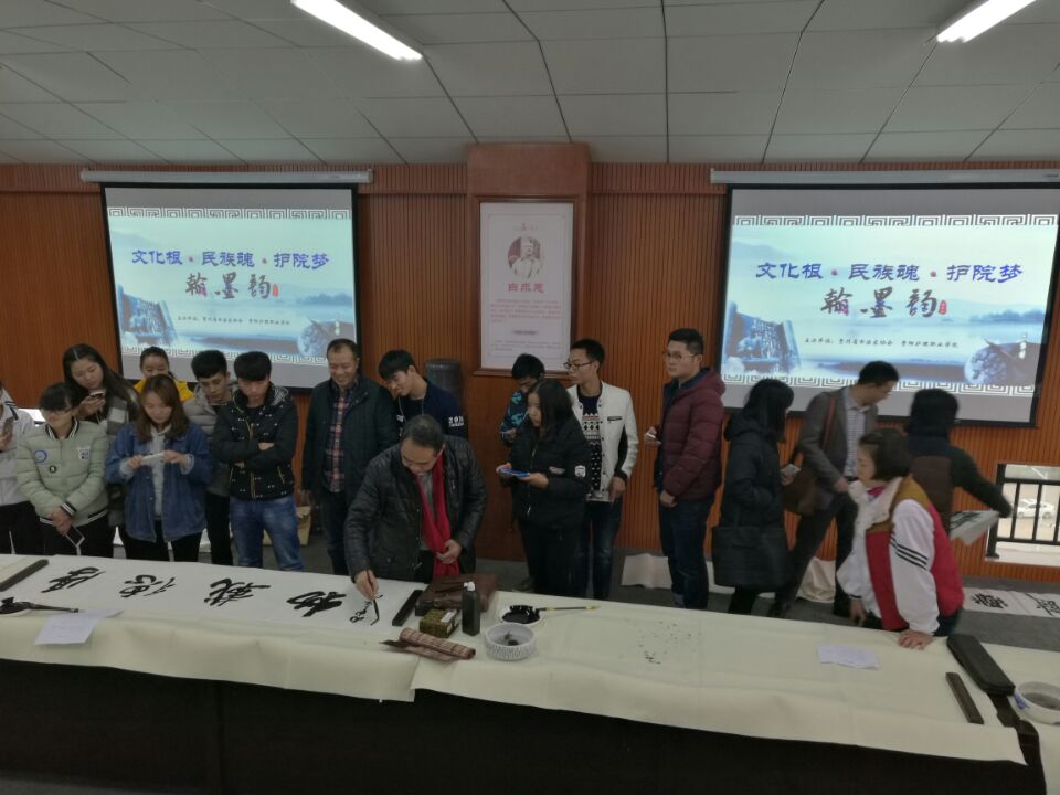 活动邀请了中国书法家协会理事、贵州省书法家协会副主席兼秘书长杨昌刚,中国书协会员、贵州省书协教育委员会主任梁兴福,中国书协会员、贵州师范大学美术学院副教授杨树森,中国书协会员、书法学博士谢安辉,贵州民族大学书法硕士生导师李茂江,书法硕士、贵州民族大学书法学老师陈荣谦,以现场作品点评,书法鉴赏,现场笔会的形式开展。杨昌刚老师指出,书法是汉字的书写艺术,是中华民族传统文化的瑰宝,必须加大普及力度,要让学习书法与培养学生的道德素质、身心素质、智能素质及良好的学习和生活习惯,个性塑造及审美能力相结合,在学习中感悟中华文化的博大精深。梁兴福老师以《书法之美》为题,从线条之美、气韵之美、和谐之美、形式构成之美教会大家如何欣赏一幅书法作品。在互动点评环节,各位老师幽默诙谐的点评,使大家对书法这一艺术,有了更深刻的理解和感悟。