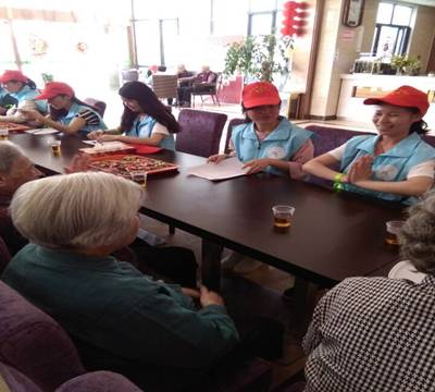 志愿者们来到老人们中间,与他们聊天,和他们玩扑克、下棋、猜谜语,还为老人表演各种节目,老人们十分高兴,有些老人还主动为志愿者们唱起了红歌。有些志愿者还将行动不便的老人搀扶着去室外晒太阳,为老人们捶捶背,揉揉腿,做一些力所能及的事情。